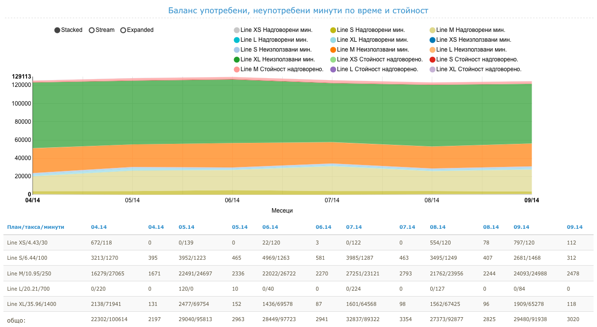 В "Тенденции" може да се проследи най-правилно употребата на безплатни минути за абсолютно всеки абонат и да се прецезира най-подходящия месечен тарифен план на база употреба на безплатните минути и потребление на абоната за шест месечен период.